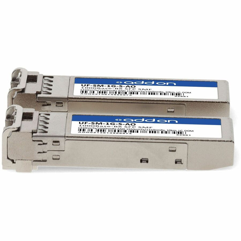 This pair of Ubiquiti® UF-SM-1G-S compatible SFP transceivers provides 1000Base-BX throughput up to 3km over single-mode fiber (SMF) using a wavelength of 1310nmTx/1550nmRx and 1550nmTx/1310nmRx via an LC connector. This bidirectional unit must be used with another transceiver or network appliance of complementing wavelengths. Each is guaranteed to be 100% compatible with the equivalent Ubiquiti® transceiver. This easy to install, hot swappable transceiver has been programmed, uniquely serialized and data-traffic and application tested to ensure that it will initialize and perform identically. Digital optical monitoring (DOM) support is also present to allow access to real-time operating parameters. This transceiver is Trade Agreements Act (TAA) compliant. We stand behind the quality of our products and proudly offer a limited lifetime warranty.
