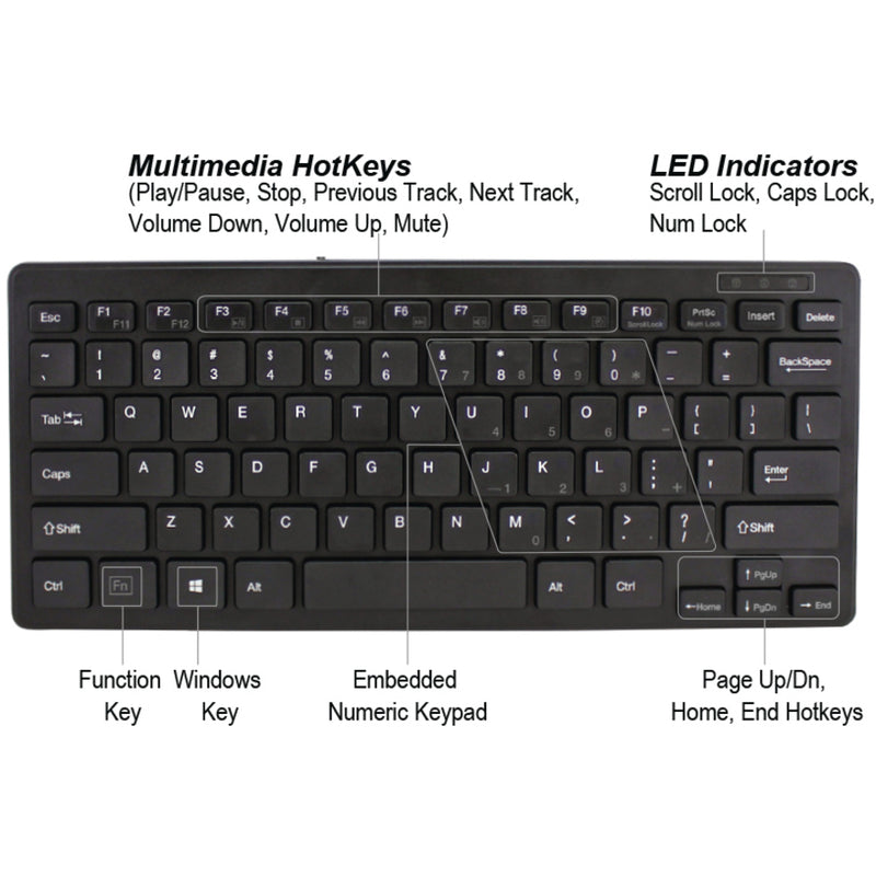 - Mini Keyboard Featuring 78 Keys - The mini size keyboard is designed with 78 keys, and is equipped with an embedded numeric keypad, featuring a Num Lock, Scroll Lock and Caps Lock LED display.