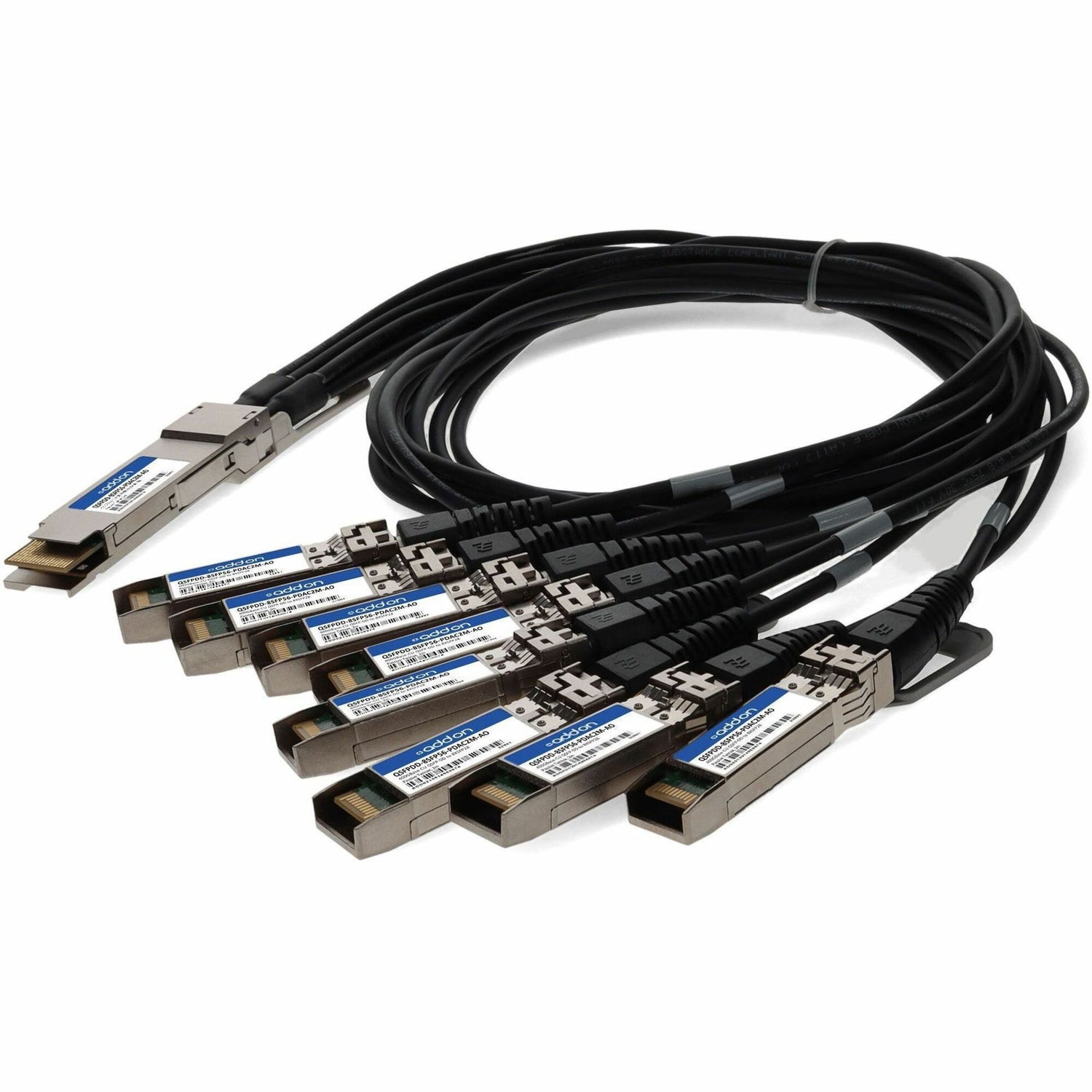 This is an industry standard 400GBase-CU QSFP-DD 400G to 8xSFP56 direct attach cable that operates over passive copper with a maximum reach of 2.0m (6.6ft). It has been programmed, uniquely serialized, and data-traffic and application tested to ensure it is 100% compliant and functional. This direct attach cable is TAA (Trade Agreements Act) compliant, and is built to comply with MSA (Multi-Source Agreement) standards. We stand behind the quality of our products and proudly offer a limited lifetime warranty.