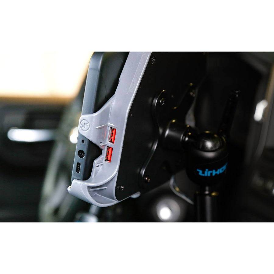 This is the new improved Samsung Tab Active2 docking station with dual powered USBs. Each USB port will deliver 1.5A of power and has an integrated cable restraint system. The docking station is compact, lockable, and can be used with one hand. When wired to your vehicle, the station provides power to your tablet's battery so it will stay charged and ready to go.