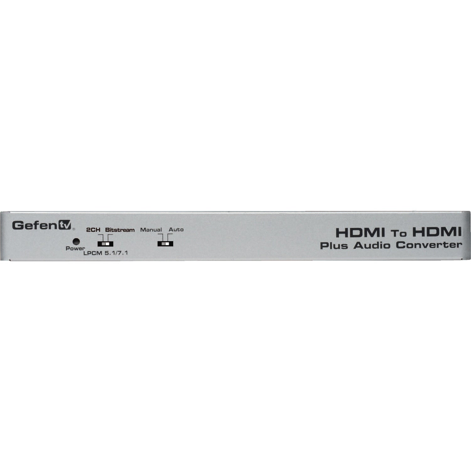 The GefenTV HDMI to HDMI Audio Converter is a product that takes a Hi-Def source using HDMI and outputs it to an HDTV display using HDMI and, in addition, up to 8 channels of LPCM audio output through eight RCA connectors. Bitstream is output to an Optical digital connector.