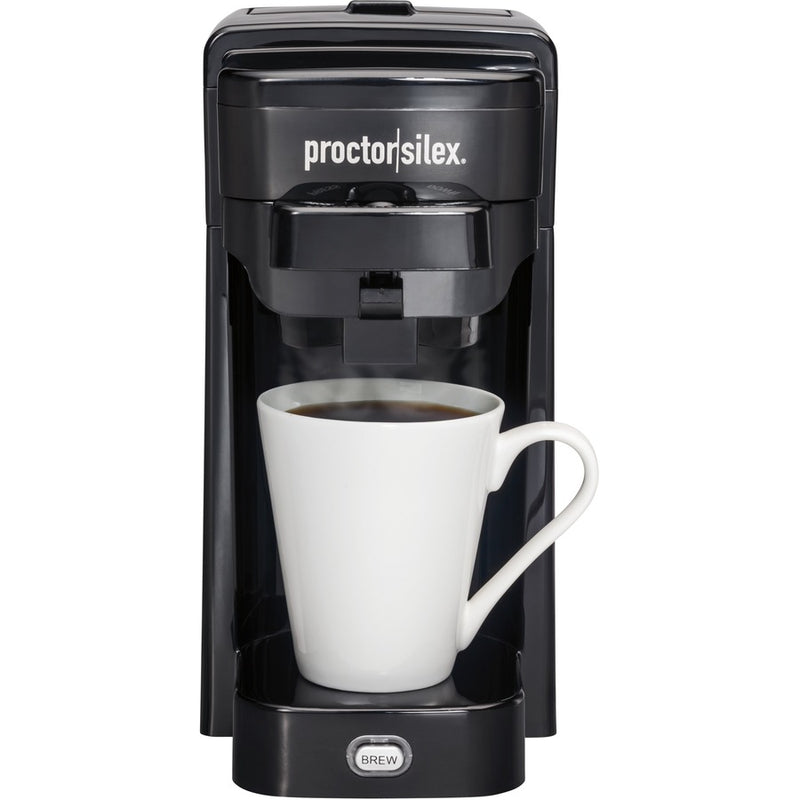 Brew a piping hot cup of fresh coffee in minutes with the Proctor Silex? Single-Serve Coffee Maker and enjoy the flexibility of 2 ways to brew. The compact, versatile design gives you the option of brewing with ground coffee or your favorite brand of pod (such as a K-Cup?* pod). Simply add coffee grounds or a pod, fill the water reservoir right from your cup, close the brew chamber and press the brew button - it's that easy. The one-touch button illuminates as coffee brews and when the brewing cycle is complete, the brew light and coffee maker shut off automatically. The Proctor Silex Single-Serve Coffee Maker lets you brew up to a 10 oz. cup of coffee, and fits practically anywhere since it's only 5.25" wide. Includes removable brew basket for ground coffee.