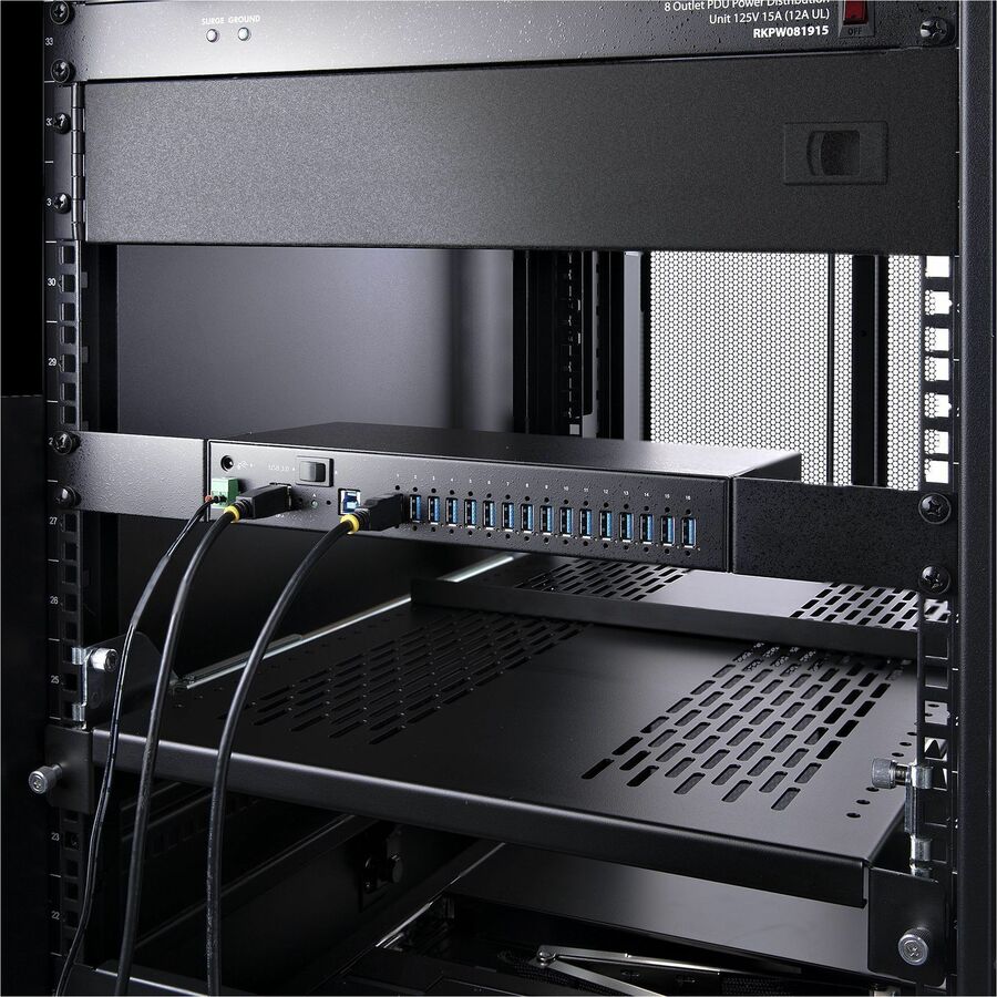The 16-Port USB hub can be attached to a surface (e.g., atop/underneath a desk or wall mounted), rack mounted, or DIN-rail mounted. The 19" rackmount rails are compliant with EIA-310-D standards, ensuring compatibility with standard racks. These rails can be used to install the USB hub into 1U of rack space for applications in data centers and server rooms. Mount industrial automation and control equipment in an electrical enclosure or cabinet, using the standard DIN-rail (Top Hat/TH) mounting hardware.