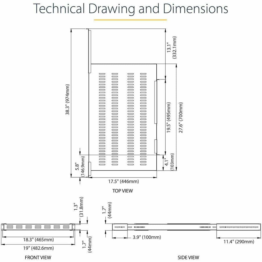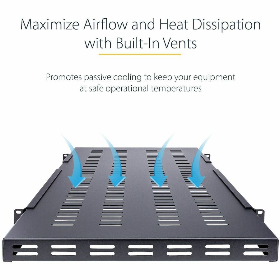 StarTech.com 1U 4-Post 19.5 to 38in Adjustable Mounting Depth Vented Rack Mount Shelf - Heavy Duty Fixed Rack Shelf - 330lbs / 150kg - 27.5in