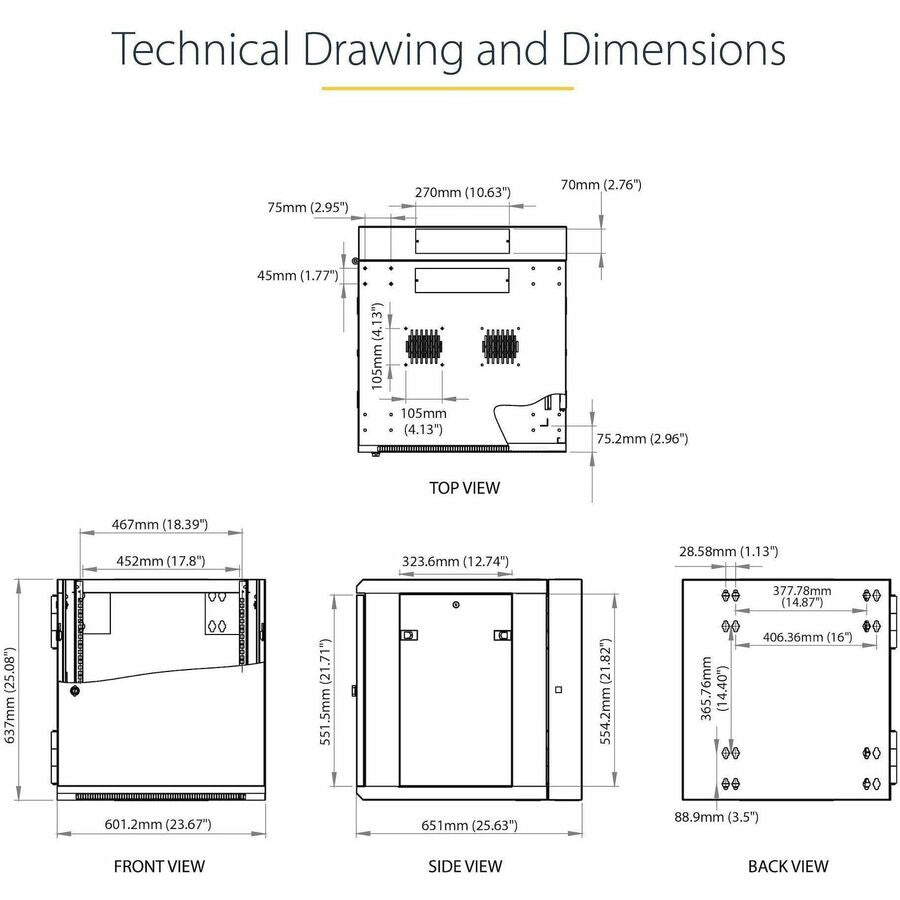This 12U server or network rack cabinet lets you mount your EIA-310 compliant equipment to the wall, in a secure enclosure that has a hinged rear door for easy access to your equipment. The enclosure features adjustable mounting depth from 2.4 to 19.7 in. to provide a robust storage solution for your rack-mount equipment.