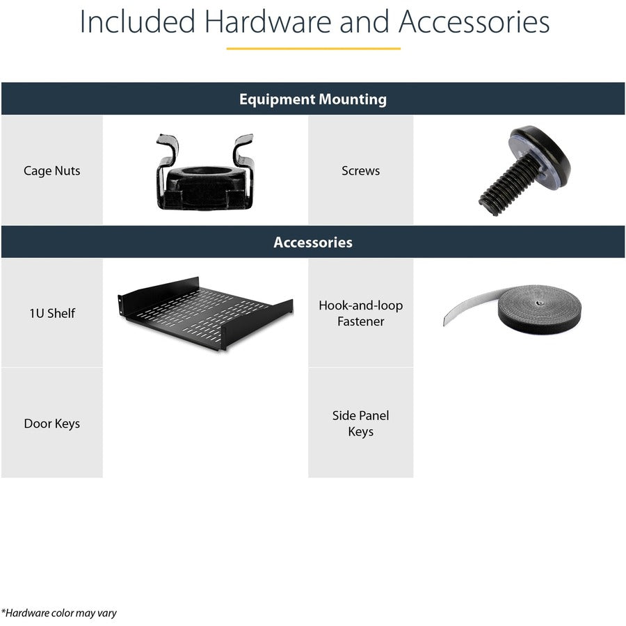 - FULLY ASSEMBLED: Swinging network cabinet ships fully assembled with all of the rack screws and cage nuts required to mount your equipment; Includes a shelf and a roll of hook-and-loop fastener; Wall-mount equipment cabinet is EIA/ECA-310-E Compliant