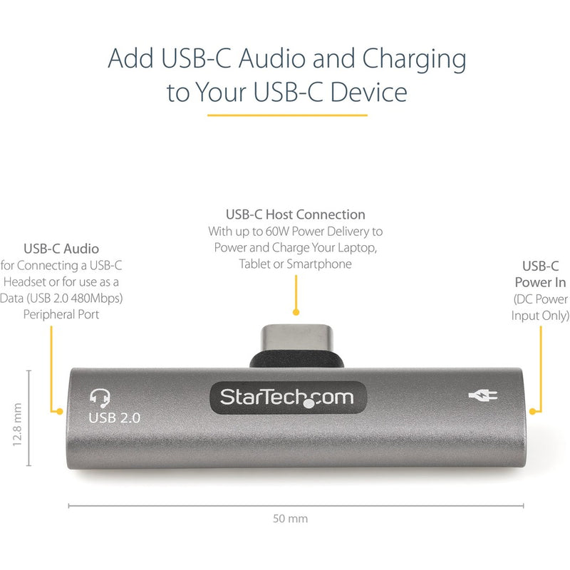 This USB C audio adapter with 60W power delivery features a USB Type-C™ audio port for your headset, audio out or data transfer, while allowing you to charge your laptop, tablet, or smartphone at the same time.
