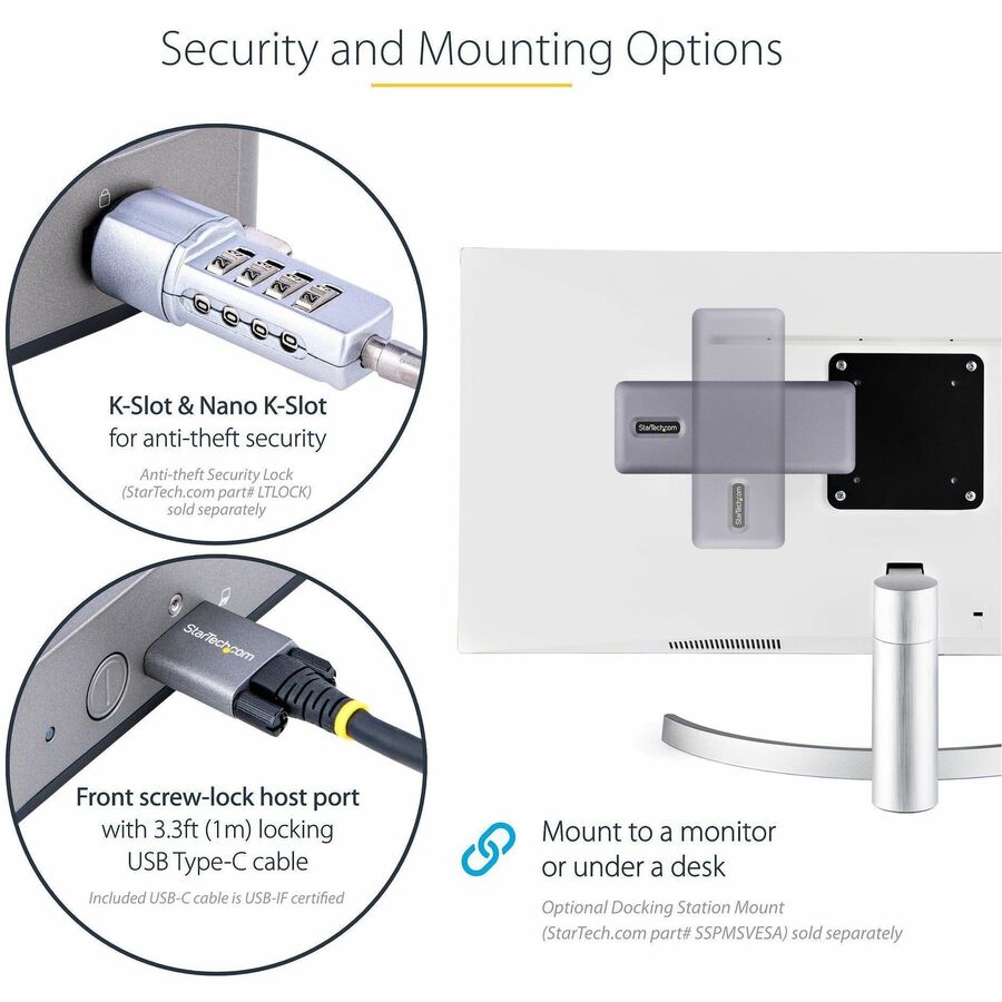 - SECURE & EASY SETUP: Ideal for all Chromebooks incl. ChromeOS Enterprise Devices; 3.3ft locking USB-C cable; Front facing host port (screw-locking) & Power/Mode button; Automatic driver install; K-Slot/Nano-Slot for anti-theft security anchor; Mount Holes